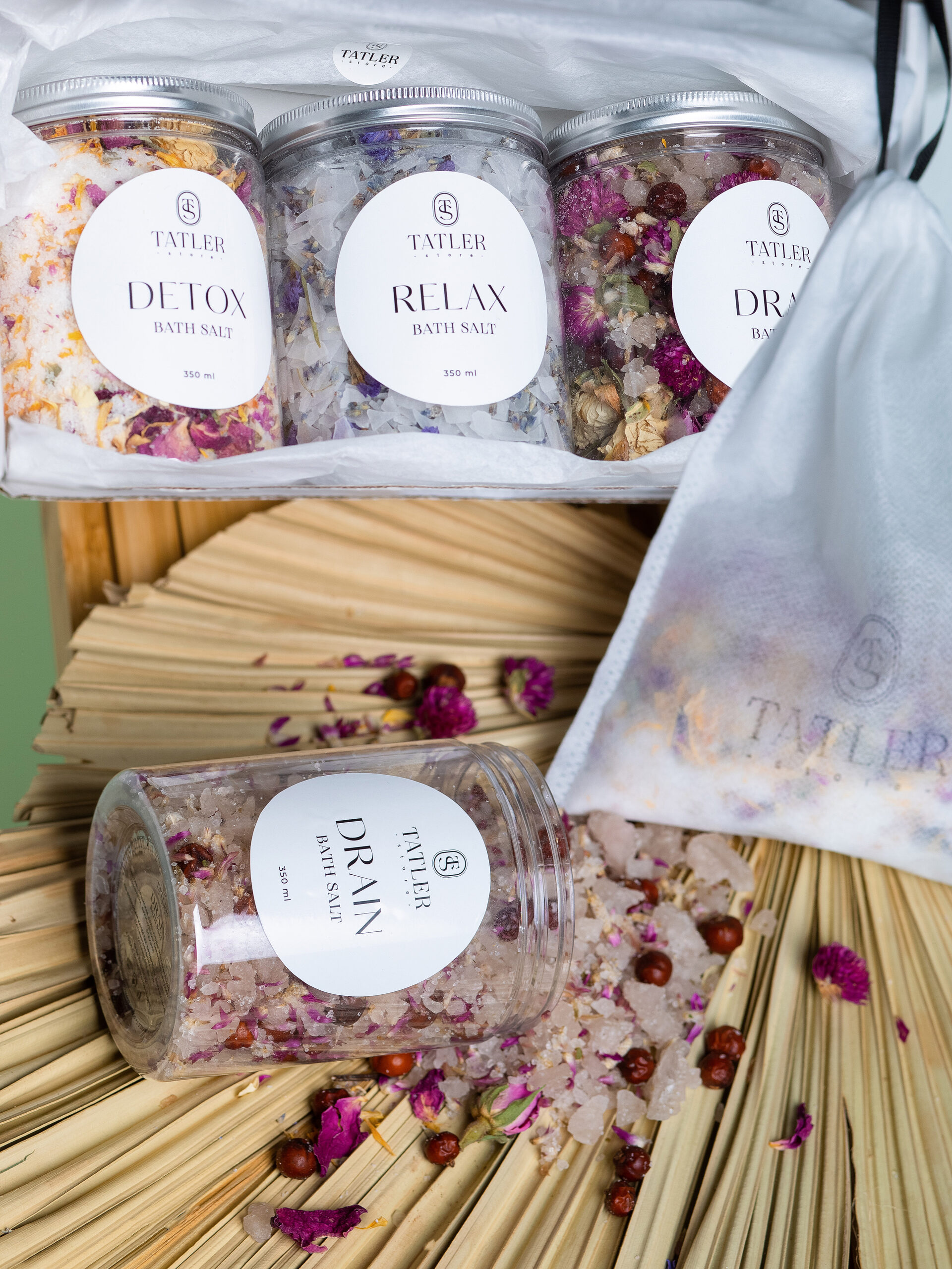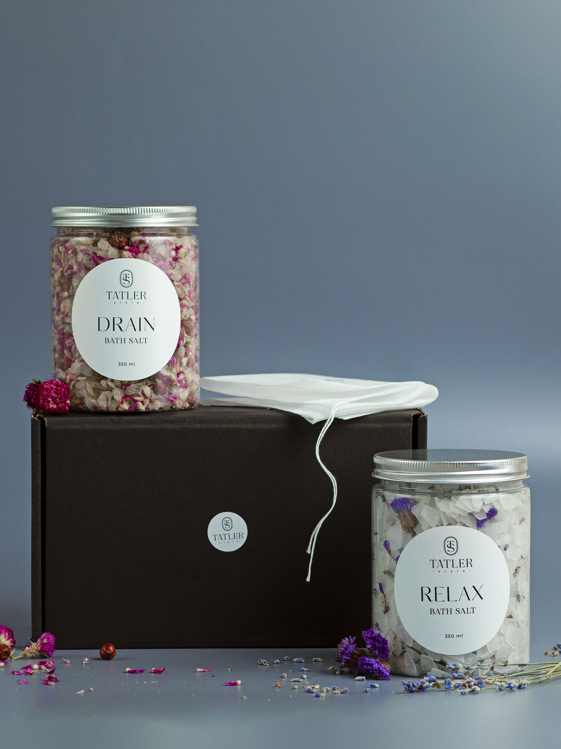 1. Дренажная морская соль DRAIN BATH SALT с ароматом кедра и можжевельника (объем 350 мл) для похудения, детоксикации, укрепления иммунитета Состав: Крымская соль, ягоды можжевельника, гомфрена, парфюмированная отдушка 2. Расслабляющая магниевая соль RELAX BATH SALT с ароматом лаванды для расслабления нервной системы, лечения суставов, улучшения качества сна Состав: Бишофит (магниевая соль в хлопьях), лаванда, незабудка, парфюмированная отдушка 3. Пилинг варежка для скрабирования (1 шт.) 4. Фильтр-мешочки для соли (2 шт.)