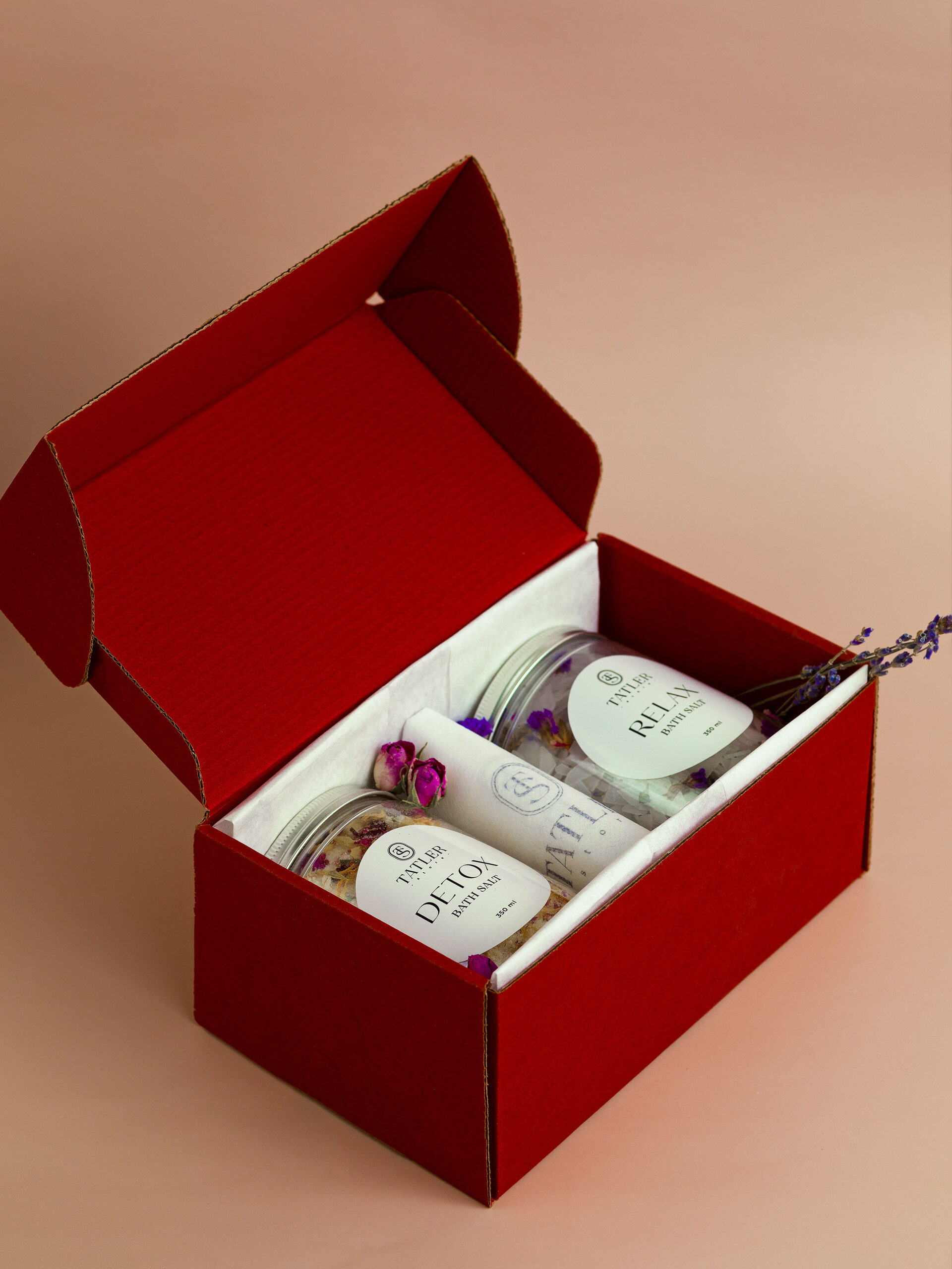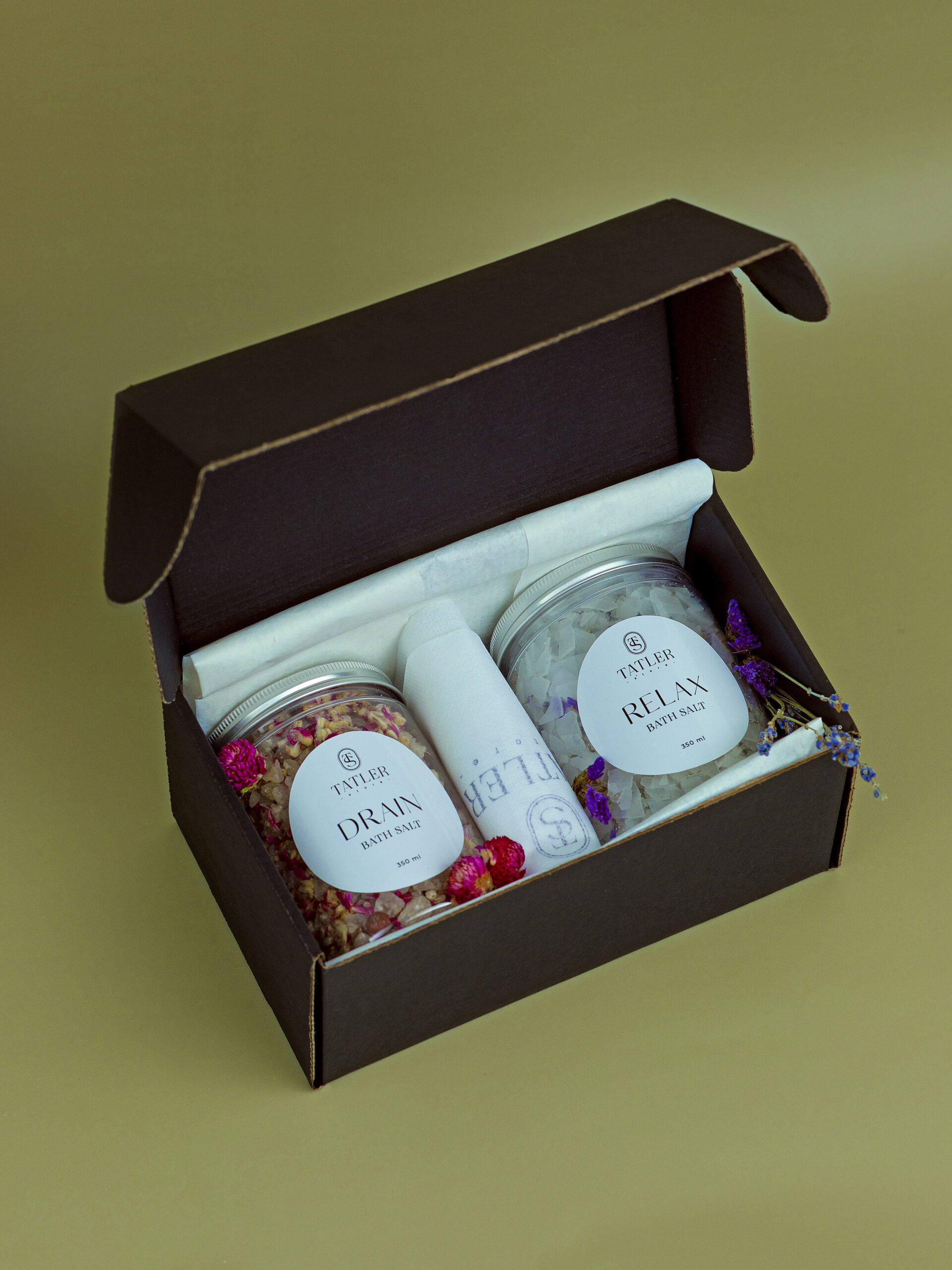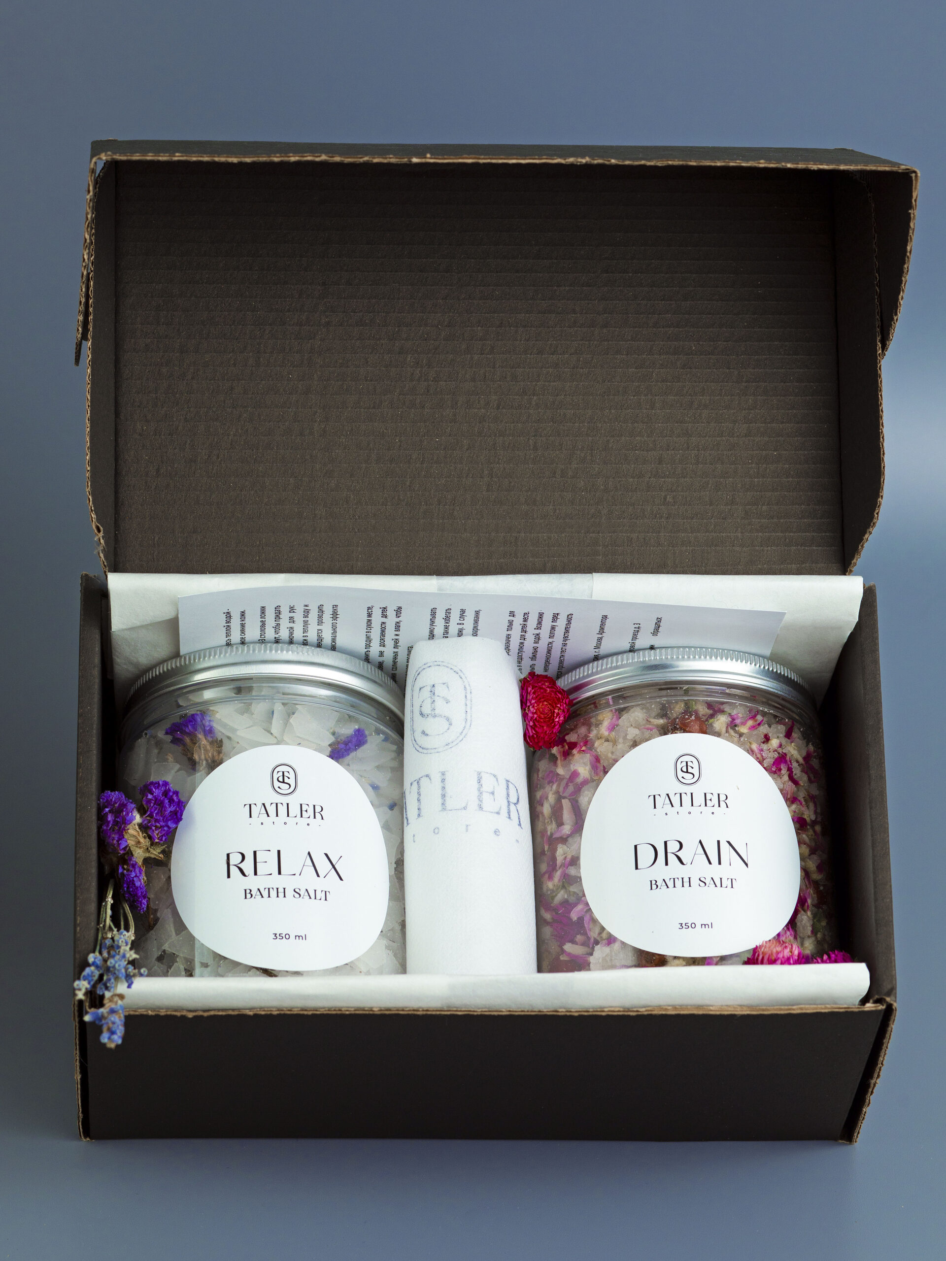 1. Детокс магниевая соль (DETOX BATH SALT) с ароматов розы и пиона для снятия тревожности, вывода токсинов из организма и смягчения кожи. Состав: Английская магниевая соль, лепестки и бутоны роз, календула, парфюмированная отдушка 2. Расслабляющая магниевая соль RELAX BATH SALT с ароматом лаванды для расслабления нервной системы, лечения суставов, улучшения качества сна Состав: Бишофит (магниевая соль в хлопьях), лаванда, незабудка, парфюмированная отдушка 3. Пилинг варежка для скрабирования (1 шт.) 4. Фильтр-мешочки для соли (2 шт.)